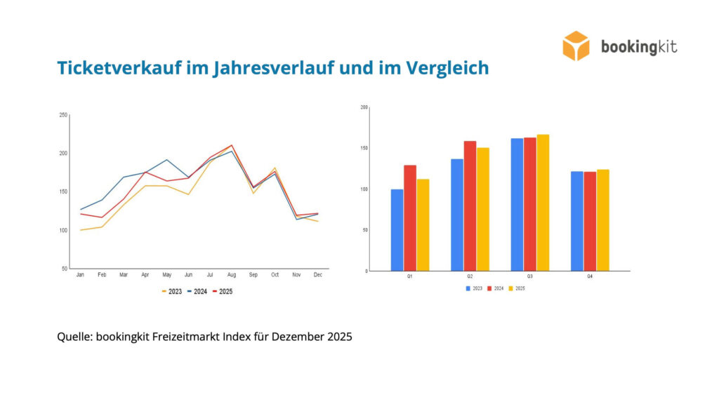 bookingkit analysiert jeden Monat aggregierte Buchungs- und Umsatzdaten von Tausenden Freizeitbetrieben in ganz Europa. Die aktuellen Ergebnisse für Dezember und das gesamte vierte Quartal 2025 zeigen einen klaren Wendepunkt: Q4 schließt als umsatzstärkstes viertes Quartal aller Zeiten ab, die Nachfrage in den Wintermonaten erweist sich als strukturell belastbar, und die Preisentwicklung hat sich auf einem nachhaltigen Niveau stabilisiert. Das klassische Bild einer ausgeprägten Nebensaison verliert damit weiter an Bedeutung.