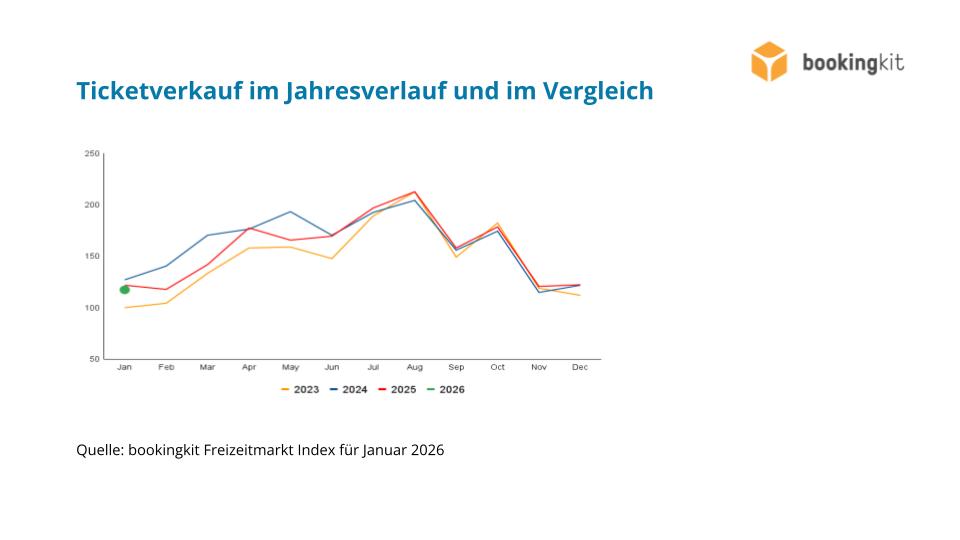bookingkit analysiert jeden Monat aggregierte Buchungs- und Umsatzdaten von Tausenden Freizeitbetrieben in ganz Europa. Die aktuellen Ergebnisse für Januar 2026 zeigen einen positiven Start ins neue Jahr: Der verarbeitete Umsatz übertrifft die Vergleichswerte der vergangenen drei Jahre deutlich. Gleichzeitig stabilisiert sich das Preisniveau weiter auf hohem Stand. Während das Ticketvolumen leicht unter den Vorjahreswerten liegt, erzielen Anbieter höhere Erlöse pro Gast – ein klares Zeichen für eine zunehmend wertorientierte Marktdynamik.
