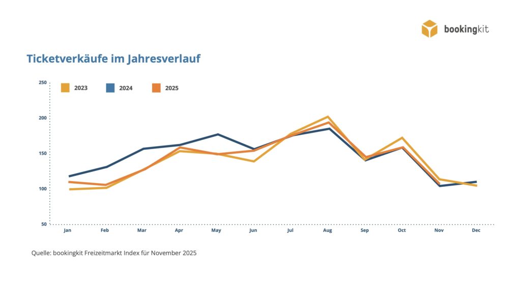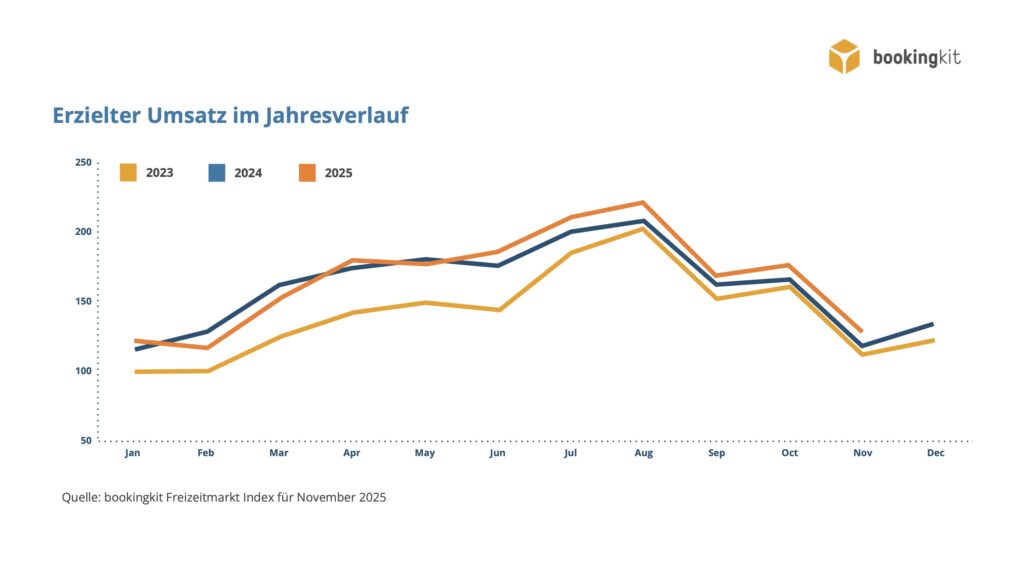bookingkit analysiert jeden Monat aggregierte Buchungs- und Umsatzdaten von Tausenden Freizeitbetrieben in ganz Europa. Die aktuellen Ergebnisse für November zeigen: Nach mehreren Jahren mit starken Ausschlägen pendelt sich der Markt zunehmend ein. Die Nachfrage bleibt stabil, das Preisniveau hält sich auf hohem Stand – und viele Anbieter richten ihren Fokus jetzt klar auf Effizienz und Wertschöpfung.