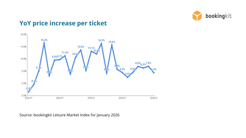 Ticket prices continue to show positive year-over-year growth, maintaining the upward trajectory established throughout 2025. Although the rate of increase has stabilised compared to the pronounced spikes seen last year, the data confirms that pricing power remains robust. Operators are successfully holding higher yield floors without relying on aggressive price hikes, reinforcing a mature and stable pricing environment at the start of 2026.