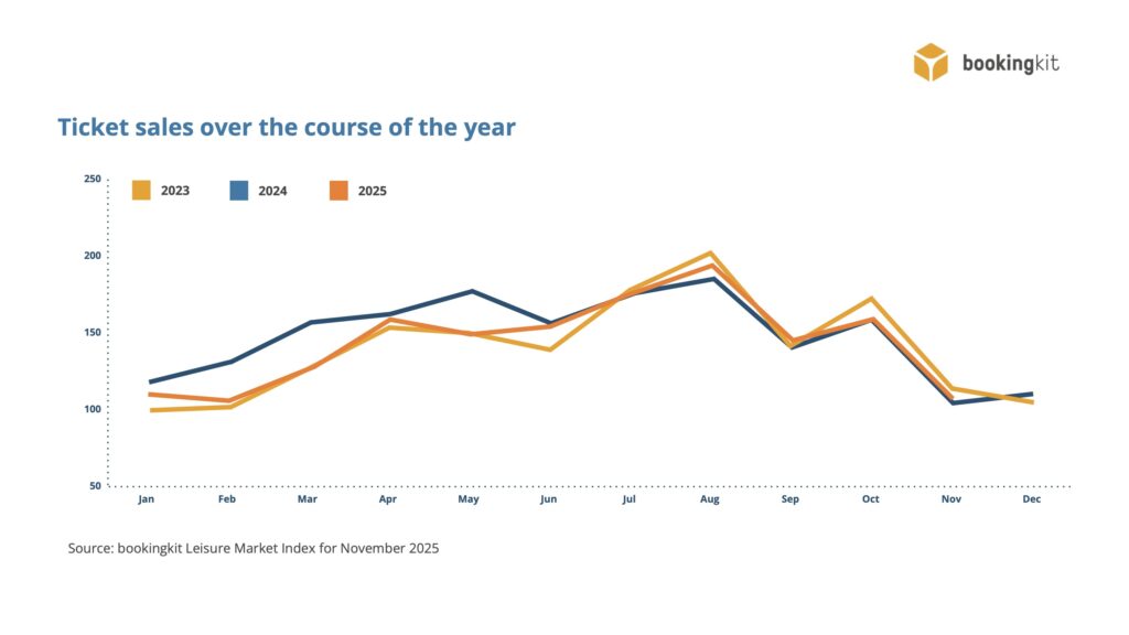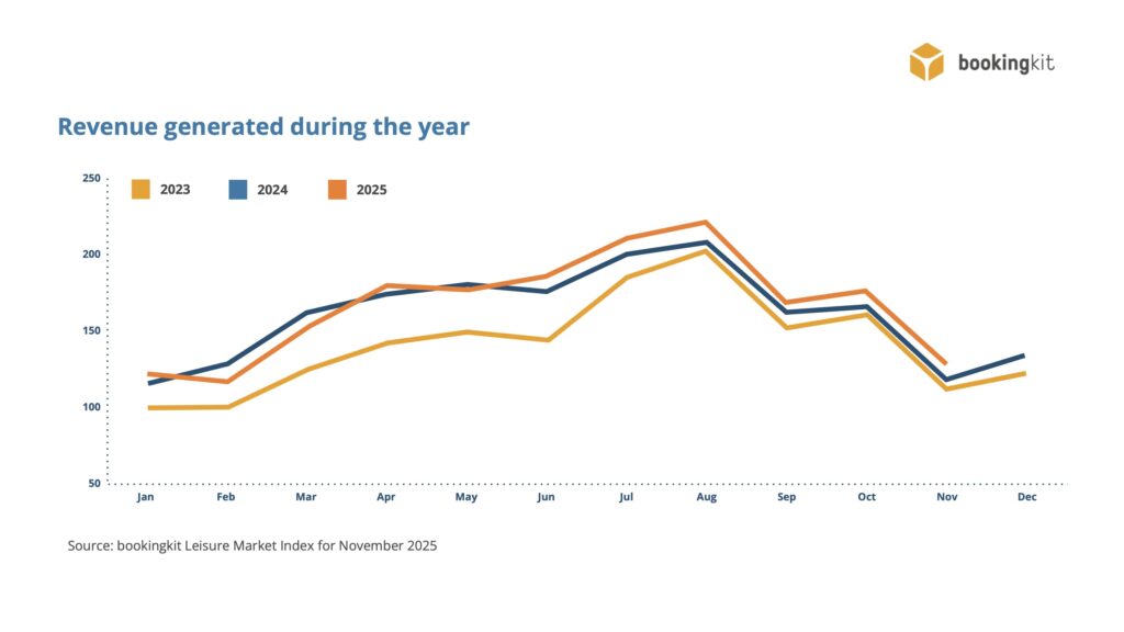 Each month, bookingkit analyses aggregated booking and revenue data from thousands of leisure providers across Europe. The latest insights for November show a market that is now settling into predictable patterns after several years of volatility. Demand remains steady, price levels hold firm, and operators are shifting their focus towards efficiency and value creation.